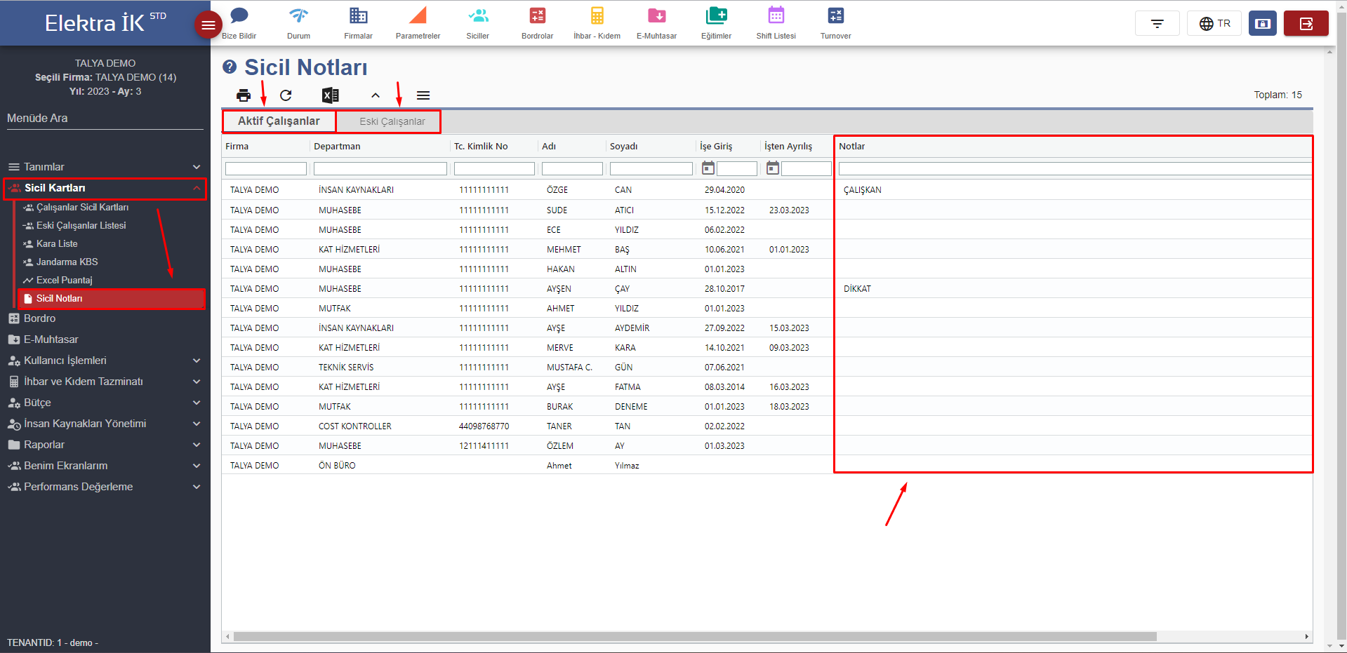**Aktif Çalışanlar:** Aktif dönemde çalışan personellere ait notların listelendiği alandır.